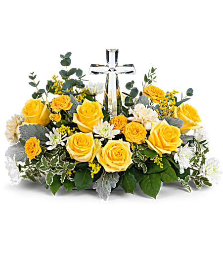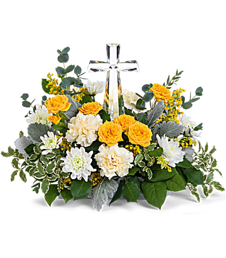 A sunny mixture of yellow and white fresh flowers surrounds a crystal cross, creating this elegant bouquet of joy and hope.