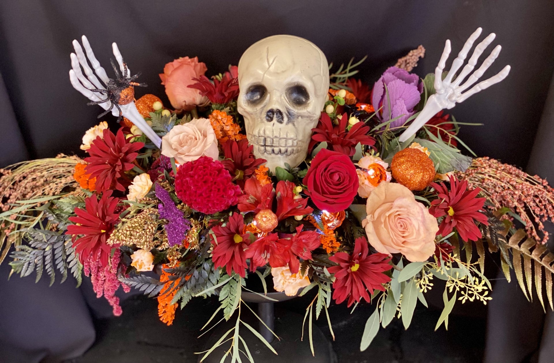 Erupting from a gorgeous assortment of Halloween fresh flowers, Billy Bones is fangtastic!