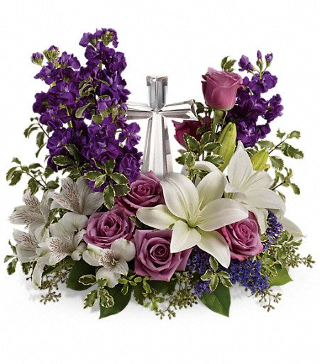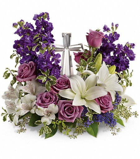 A bouquet to remember. This keepsake crystal cross is surrounded by white, lavender, and purple fresh flowers.