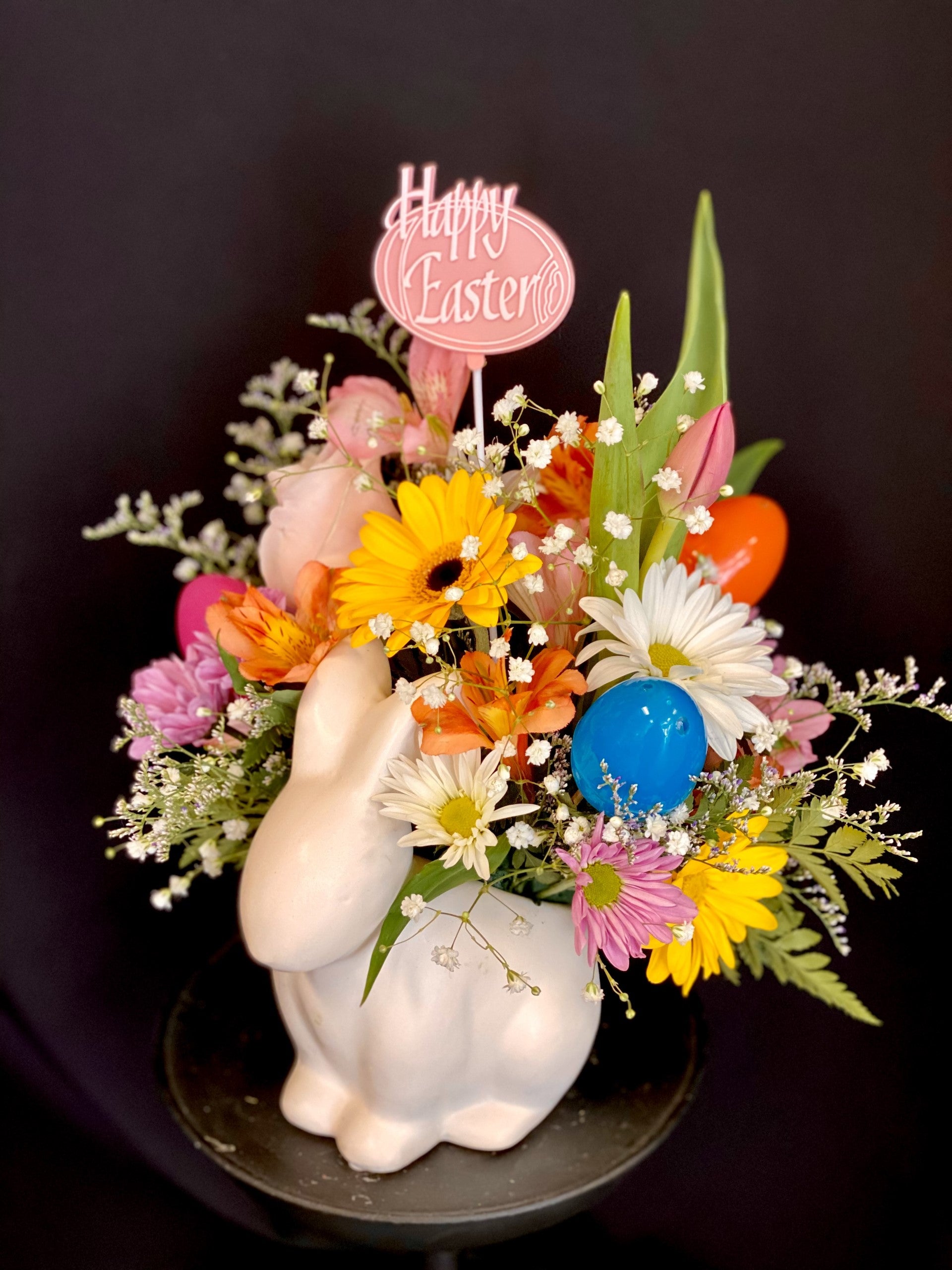 Trimmed with Easter eggs and a colorful 'Happy Easter' pic, this arrangement can double as a centerpiece!