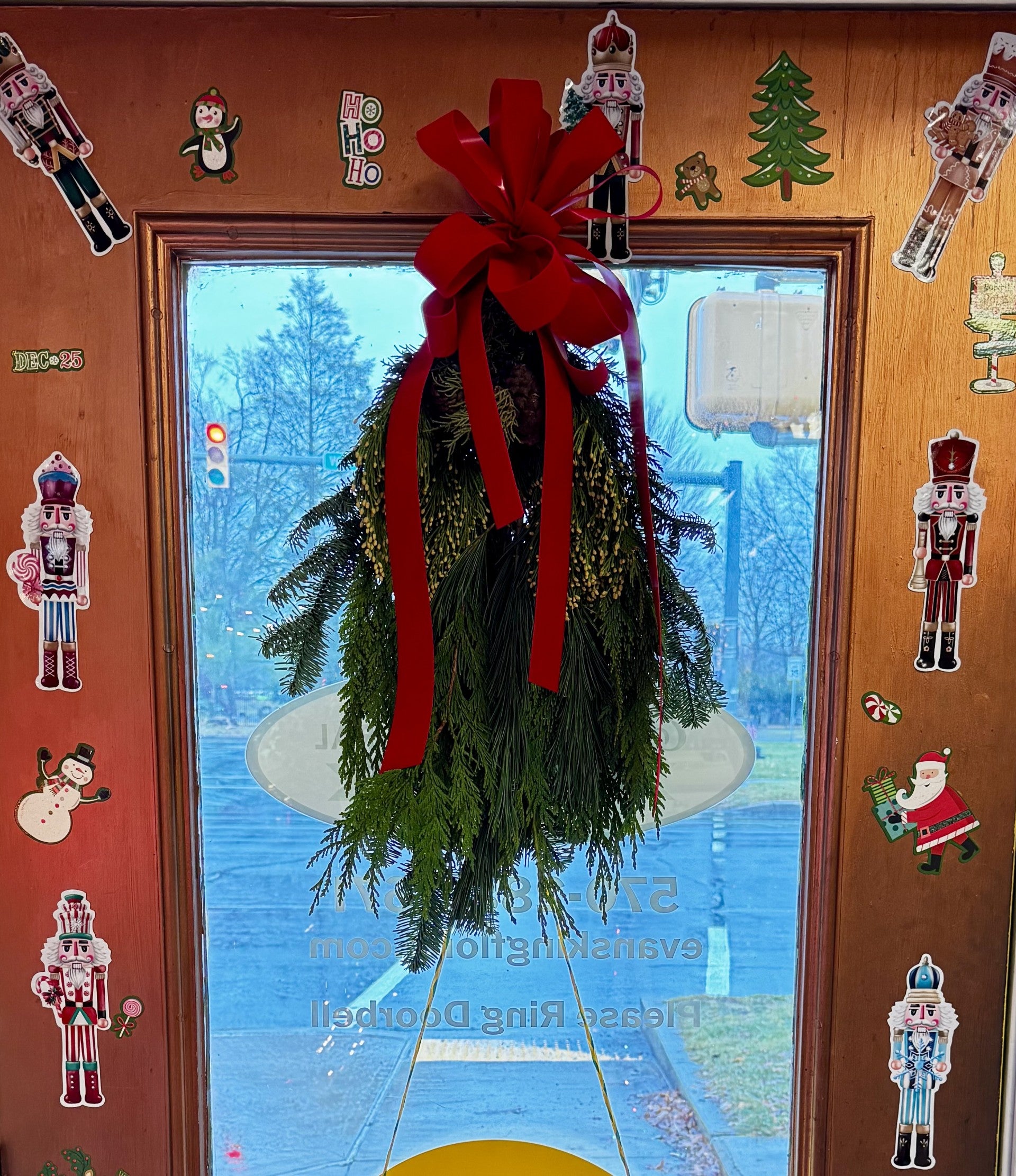 Photo shows the swag hanging on the front door inside of the flower shop.