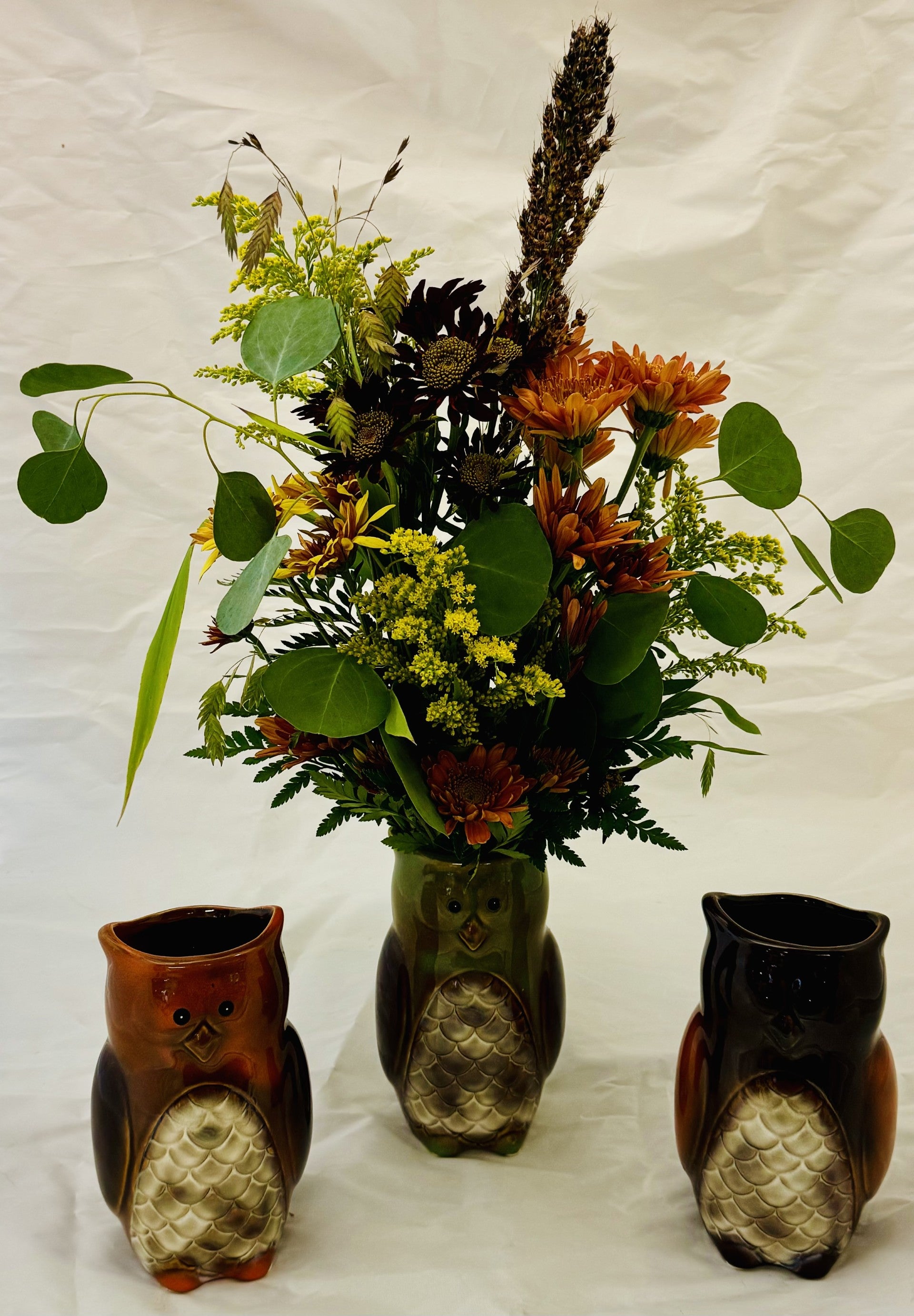 Ceramic Owl Vase is filled with assorted Fall Pompons ~ a fun gift for Autumn!