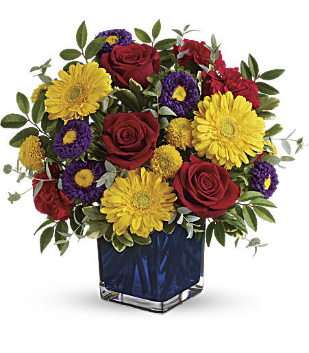 Bright and colorful fresh flowers fill a blue glass cube to create this striking arrangement.