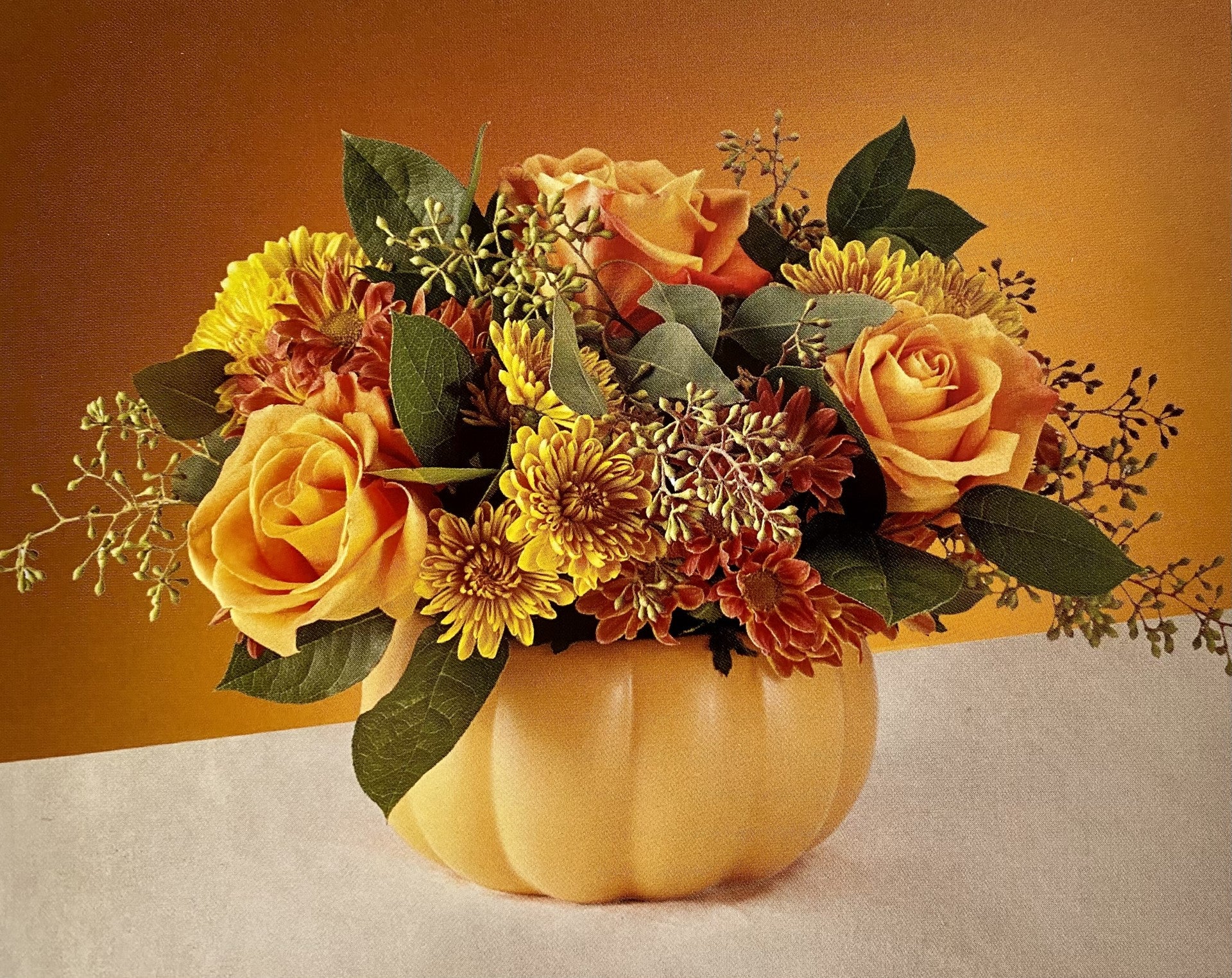 Festive and fun! A ceramic pumpkin is filled with pretty Fall Flowers -- perfect for everything Autumn!
