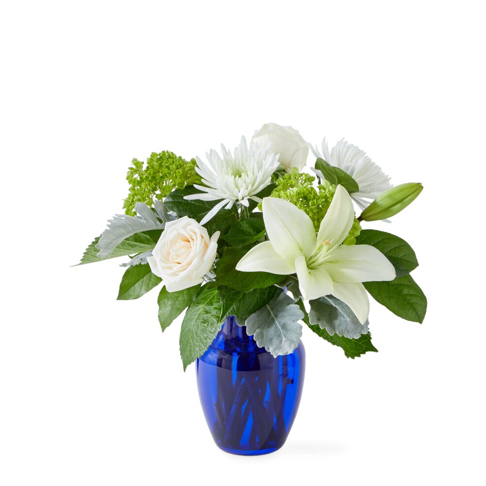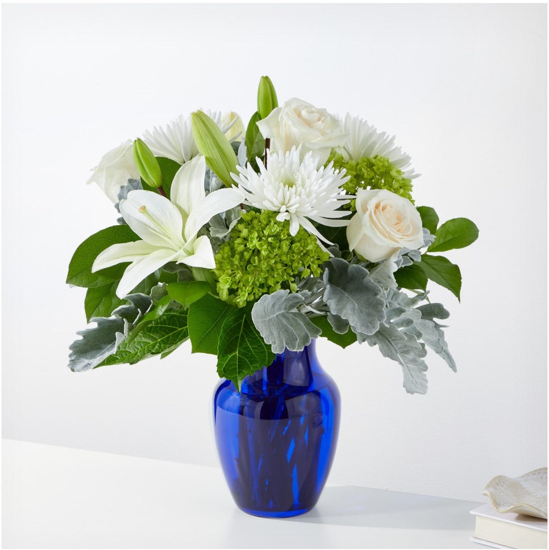 White, ivory, and green fresh flowers fill a royal blue glass vase.